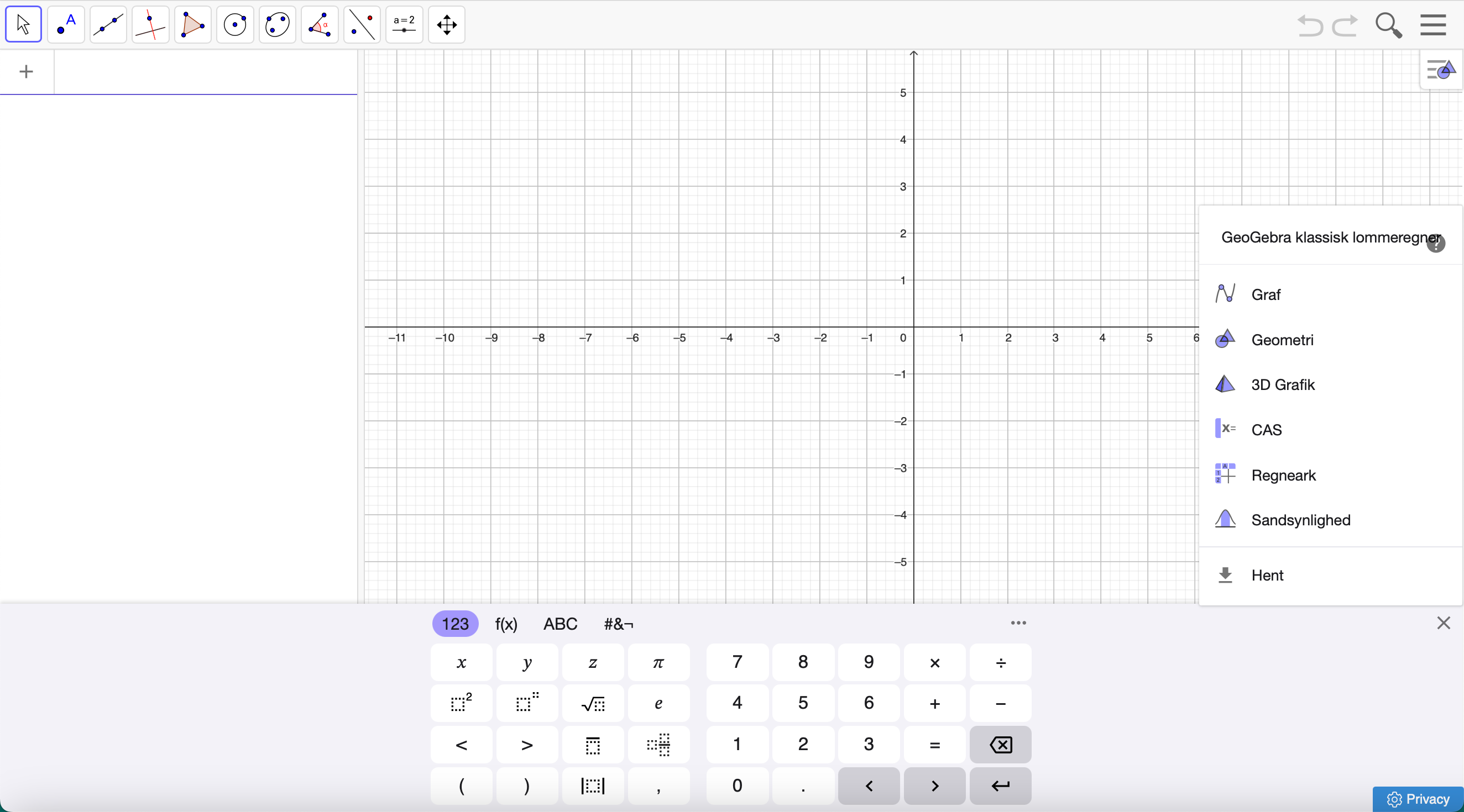 I toppen af skærmen finder du en række værktøjer, som bruges til at tegne, måle og manipulere objekter i GeoGebra. Nogle af de vigtigste værktøjer er:
